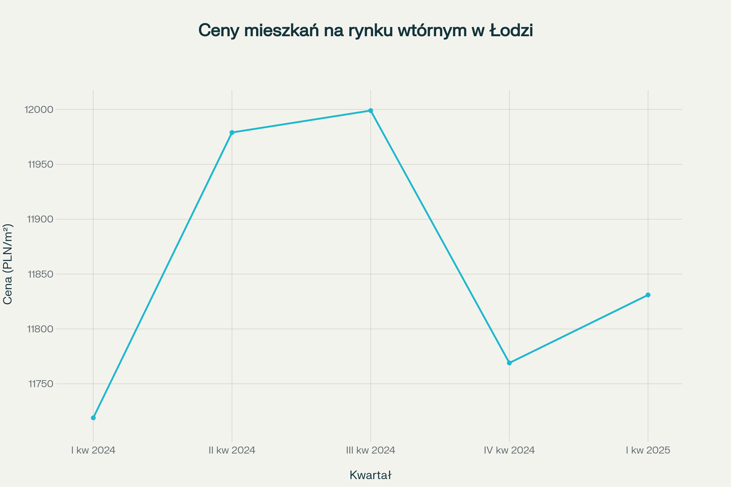 Rynek wtórny w Łodzi charakteryzuje się stabilnymi cenami z tendencją wzrostową. W I kwartale 2025 roku średnia cena mieszkań na rynku wtórnym wyniosła 11 831 PLN/m², co oznacza wzrost o 1,0% w porównaniu do tego samego okresu rok wcześniej. Taki poziom wzrostu jest znacznie niższy niż w poprzednich latach, co świadczy o stabilizacji rynku po okresie intensywnych podwyżek.